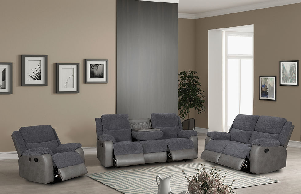 Sofá con 2 reclinables eléctricos y droptable con cargadores inalámbricos y portavasos.